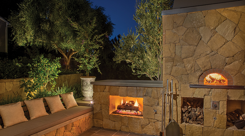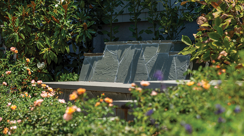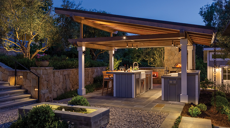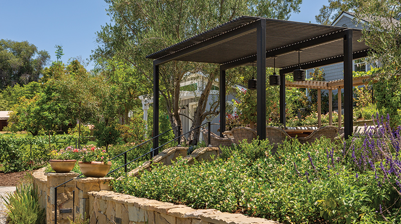 The middle of the property is anchored by a rectangular water lily fountain that lies on axis with the pool and set down with 12-foot-with wide Bluestone steps and groundcover joints. An angled, solid-roof patio cover sits to the west and covers an outdoor kitchen, behind which is a stone-clad, natural gas and woodfired pizza oven, an Isokern vent-free fireplace, and a built-in sofa that creates a smaller-scale gathering spot. Directly opposite this second outdoor kitchen is an L-shaped, built-in sofa with a firepit and wooden lattice arbor overhead. Below this area is a dining patio with a steel lattice cover.