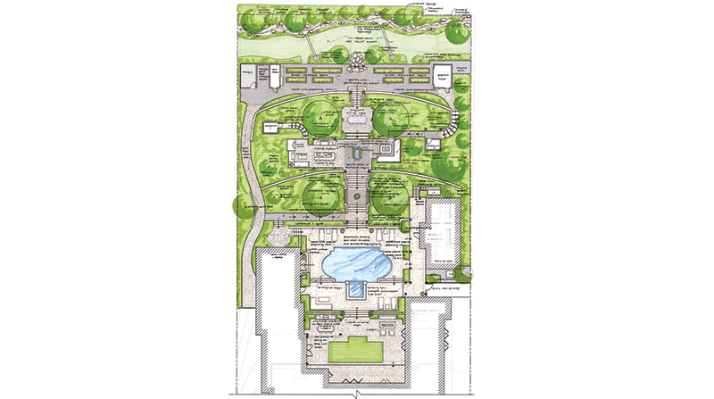 Precipitated by the addition of a master bedroom wing and additional dwelling unit (ADU), the entire backyard was eventually reimagined. The Landscape Architect prepared two design options for the 0.84-acre property makeover and the customers selected one that turned the convex-sloped site - previously laid to lawn and somewhat unusable - into a series of wide steps forming the spine of the axial design that decreases in formality as it unfolds down the hill.
