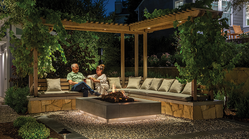 This L-shaped masonry sofa has a poured-in-place concrete seat, wood slat backrest, and Bel Air rubble stone veneer. The firepit is made of poured-in-place concrete with a well-defined cantilever at the base. A grapevine grows over the 'Con Heart' Redwood (Sequoia sempervirens) arbor.