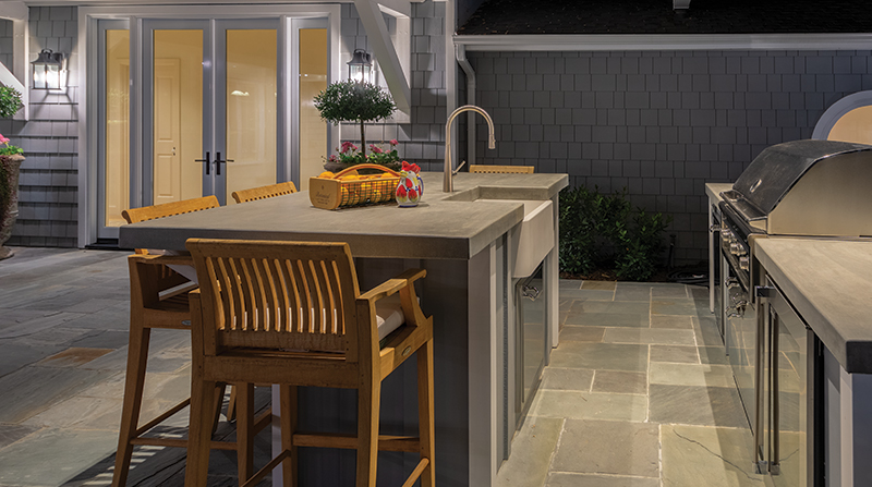 An angled roof that parallels the hillside slope and blocks the late afternoon sun covers the lower outdoor kitchen. The kitchen has counters with board and batten siding that match the house counter tops made of poured-in-place, colored concrete with a smooth trowel finish. A lily pond water feature was built by landscape contractor Eureka Landscape Services from waterproofed, poured-in-place concrete and Bluestone sides and cap. It sits on 3/8" Northern Salt and Pepper gravel.