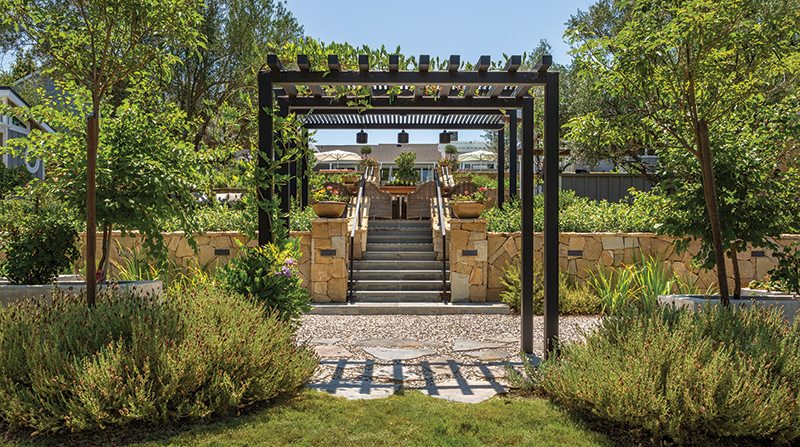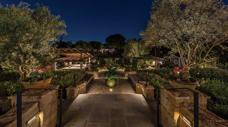 After engaging local landscape architecture firm Terry Design, Inc. to fulfill their aspirations, the couple made many references to a Napa Valley lifestyle. Landscape Architect and owner Alison Terry's interpretation of those references developed into a terraced hill with entertainment zones at various levels that provide a wealth of opportunities for family and friends to celebrate outside in a relaxed environment with a warm ambiance while enjoying good food and wine.
