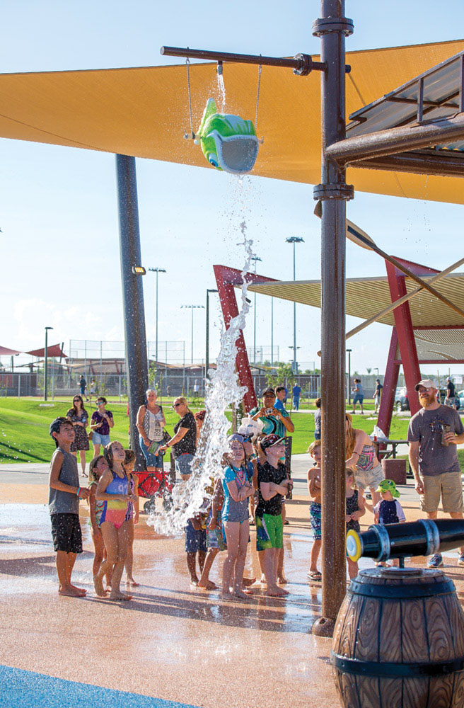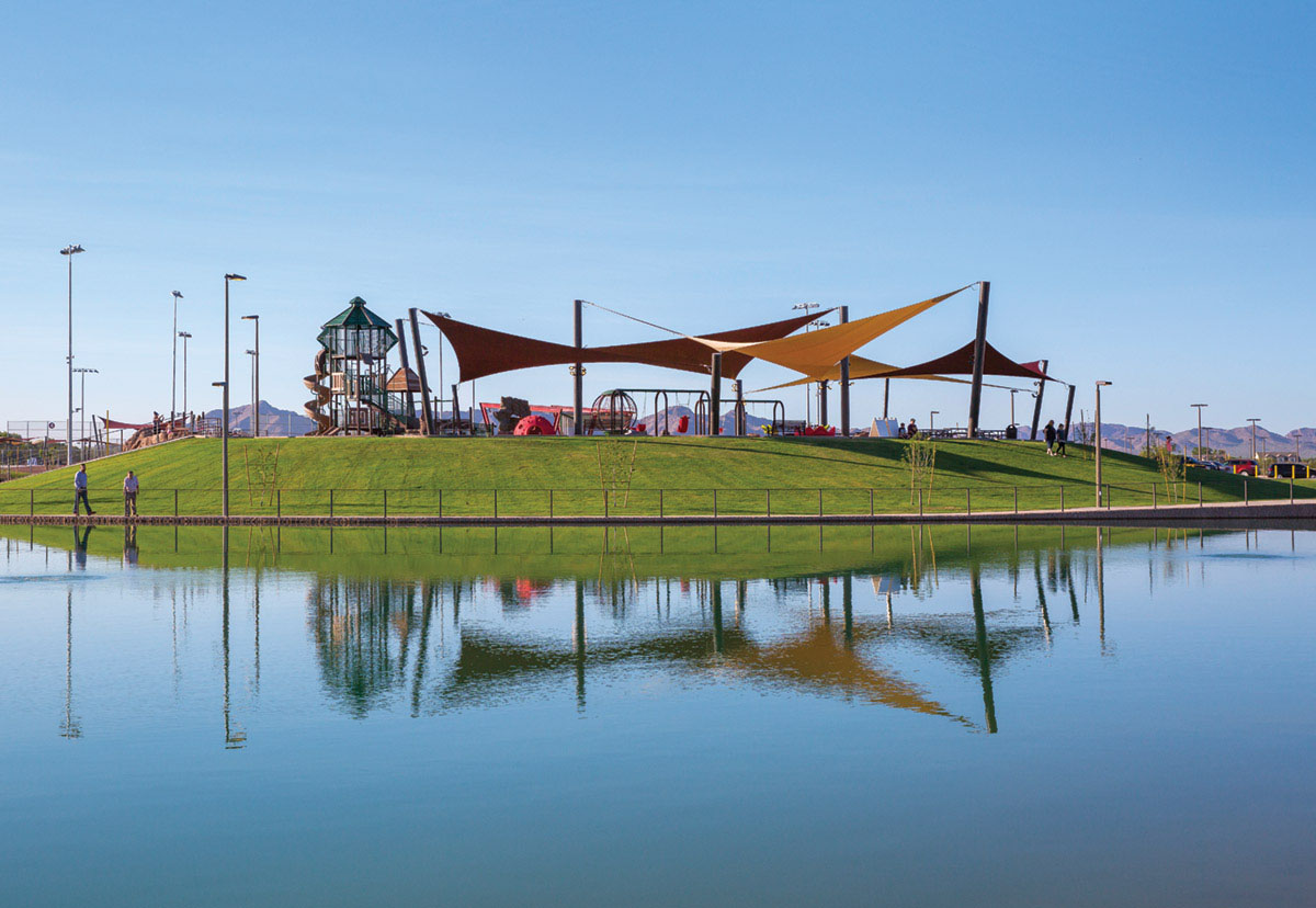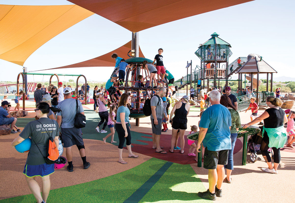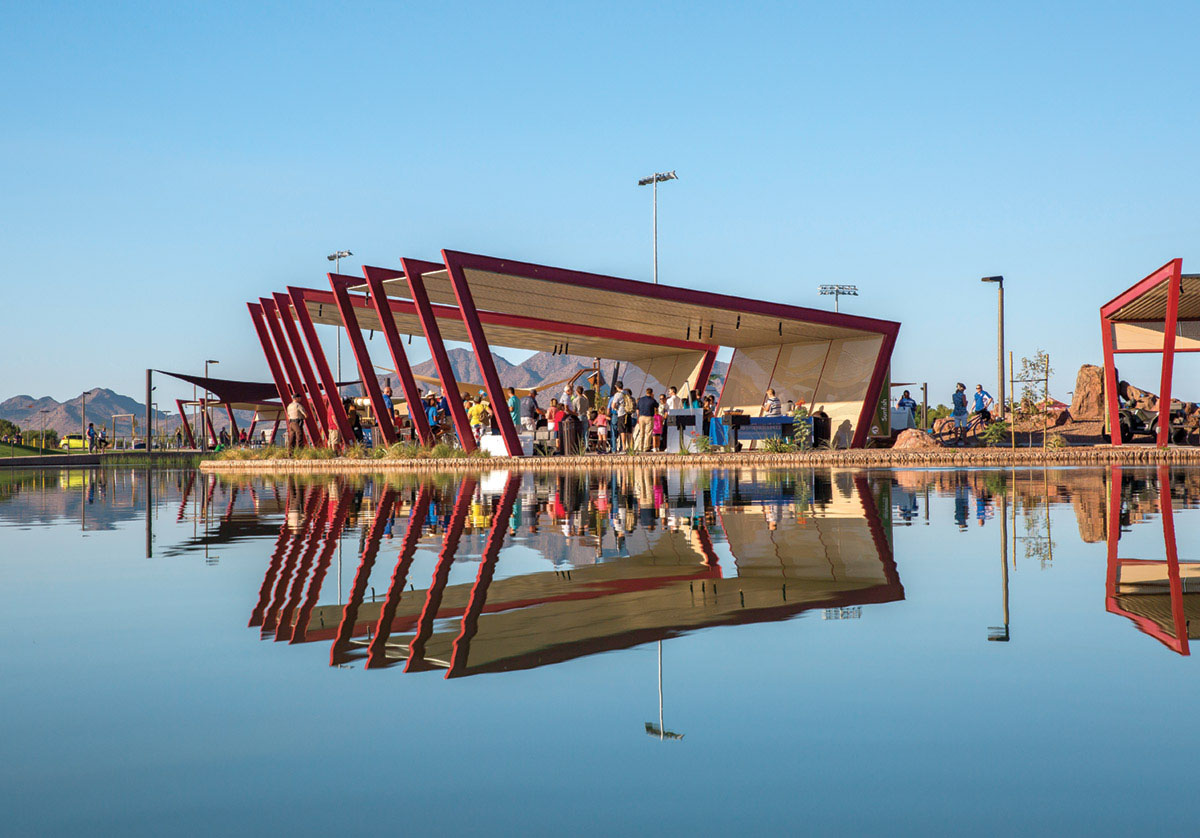 Queen Creek, Arizona's new Mansel Carter Oasis Park (MCOP) opened to the public in September 2018 after only 18 months from design to completion with Landscape Architects of J2 Engineering & Environmental Design as the lead design firm. The exciting and innovative 46-acre regional park facility serves many recreational needs for the Queen Creek community. The park provides an equestrian trailhead and resting node along the Queen Creek Wash, which links to the overall regional trail system. Upon entry, the use of stormwater harvesting bio-swales along the park roadways truly make a sustainable design impact on the site. The MCOP site design beautifully accommodates a 5-acre urban fishing lake that is stocked by the Arizona Department of Game and Fish. The lake is designed to appear larger due to the various curves and undulating edges, while still allowing for ease of maintenance. Custom shade ramadas are dappled throughout the park and may be rented for celebrations with a lakeside destination peninsula integrated into the lake design. The baseball field complex includes a raised plaza with stadium style bleacher seating, a shaded playground, restroom and concession building, abundant shade for spectators, and enclosed dugout and bullpens. There are two multi-use fields that can be utilized for soccer, football, or large-scale events. Both the baseball field complex and multi-use fields utilize total cutoff LED lighting for state-of-the-art performance and light and glare control. The elevated hilltop inclusive playground and rock-climbing wall zone provide stunning views of the San Tan Mountains to the south, while the splash-pad and sand-dig zone take advantage of beautiful lakeside views. The park site even has its own "social media photo hillside zone" complete with logo backdrop. MCOP is heavily used and loved by the community and is a destination with a true sense of place for all those living in the surrounding San Tan Valley.