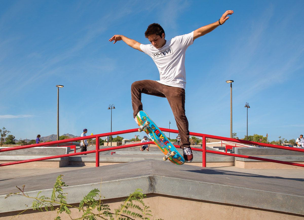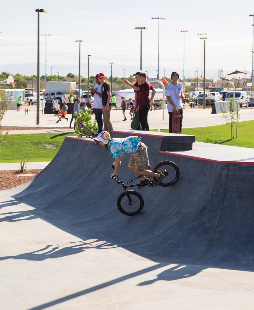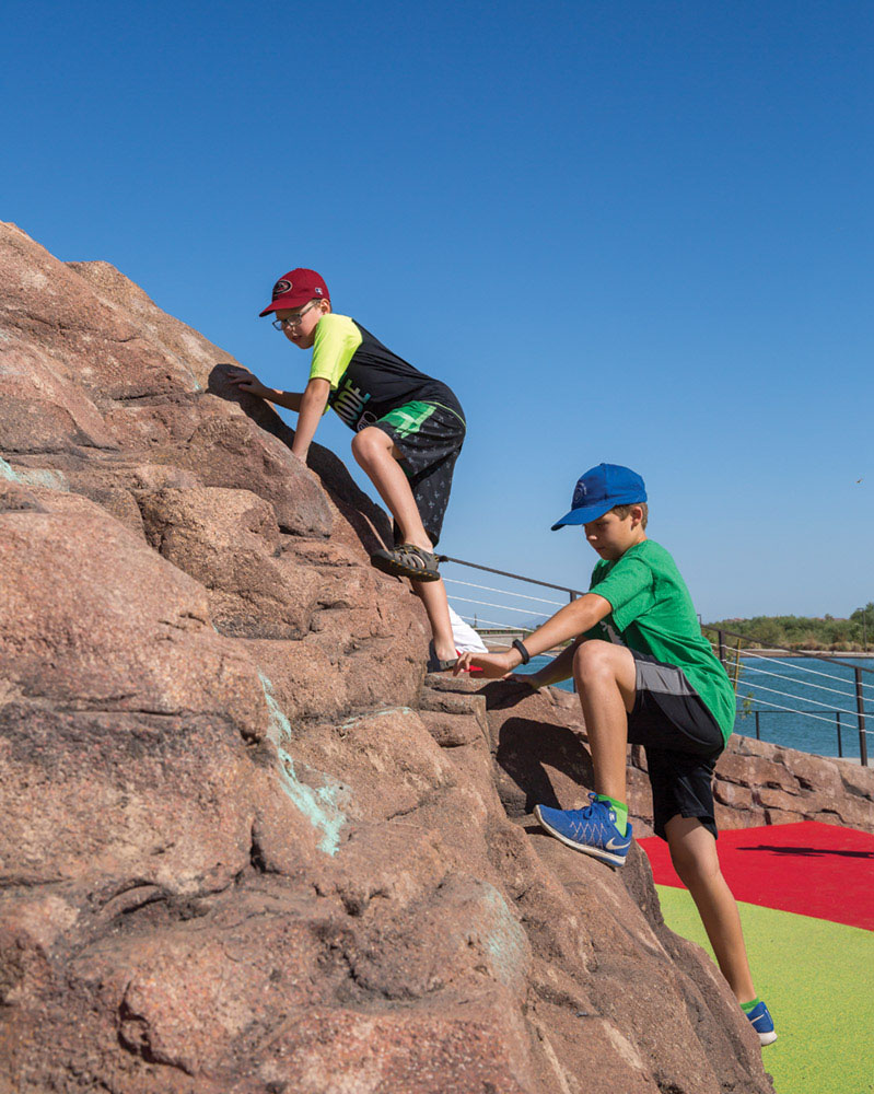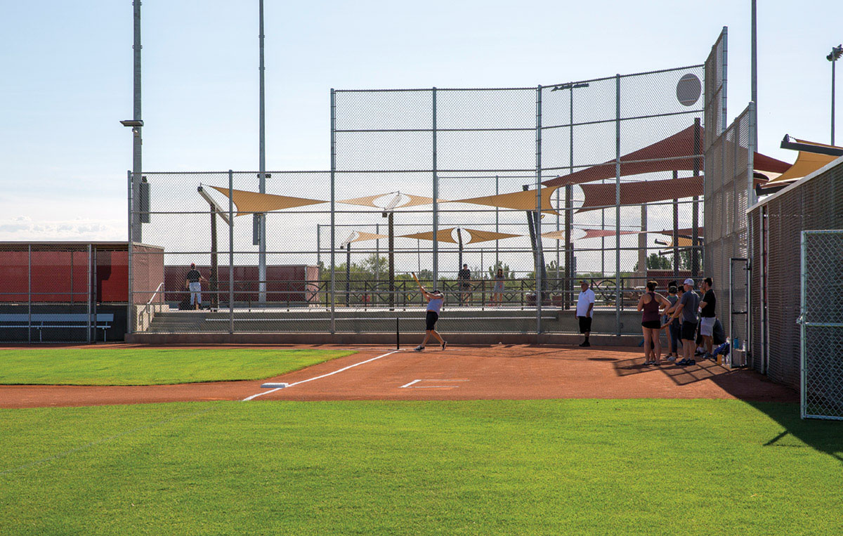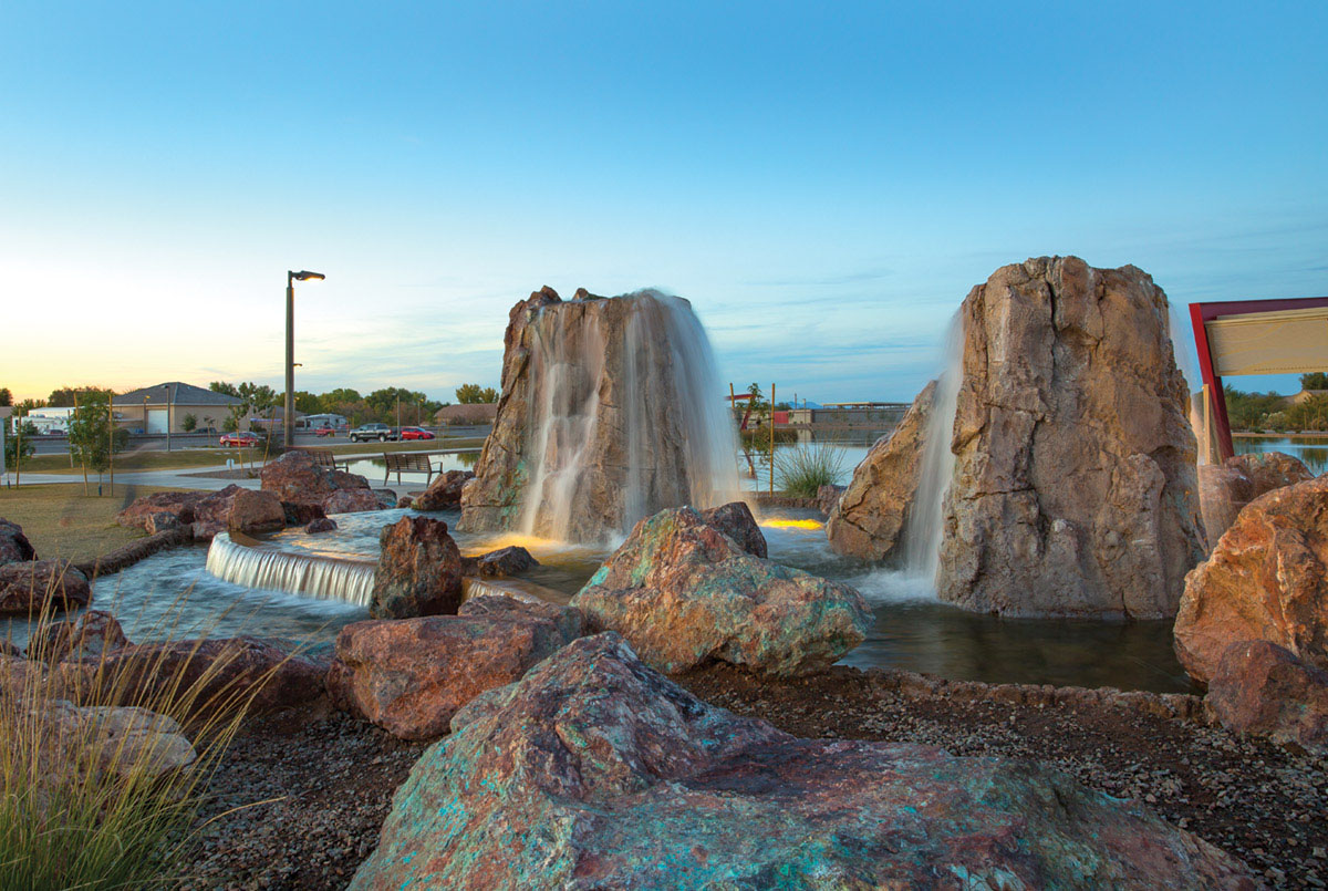 Queen Creek, Arizona's new Mansel Carter Oasis Park (MCOP) opened to the public in September 2018 after only 18 months from design to completion with Landscape Architects of J2 Engineering & Environmental Design as the lead design firm. The exciting and innovative 46-acre regional park facility serves many recreational needs for the Queen Creek community. The park provides an equestrian trailhead and resting node along the Queen Creek Wash, which links to the overall regional trail system. Upon entry, the use of stormwater harvesting bio-swales along the park roadways truly make a sustainable design impact on the site. The MCOP site design beautifully accommodates a 5-acre urban fishing lake that is stocked by the Arizona Department of Game and Fish. The lake is designed to appear larger due to the various curves and undulating edges, while still allowing for ease of maintenance. Custom shade ramadas are dappled throughout the park and may be rented for celebrations with a lakeside destination peninsula integrated into the lake design. The baseball field complex includes a raised plaza with stadium style bleacher seating, a shaded playground, restroom and concession building, abundant shade for spectators, and enclosed dugout and bullpens. There are two multi-use fields that can be utilized for soccer, football, or large-scale events. Both the baseball field complex and multi-use fields utilize total cutoff LED lighting for state-of-the-art performance and light and glare control. The elevated hilltop inclusive playground and rock-climbing wall zone provide stunning views of the San Tan Mountains to the south, while the splash-pad and sand-dig zone take advantage of beautiful lakeside views. The park site even has its own "social media photo hillside zone" complete with logo backdrop. MCOP is heavily used and loved by the community and is a destination with a true sense of place for all those living in the surrounding San Tan Valley.