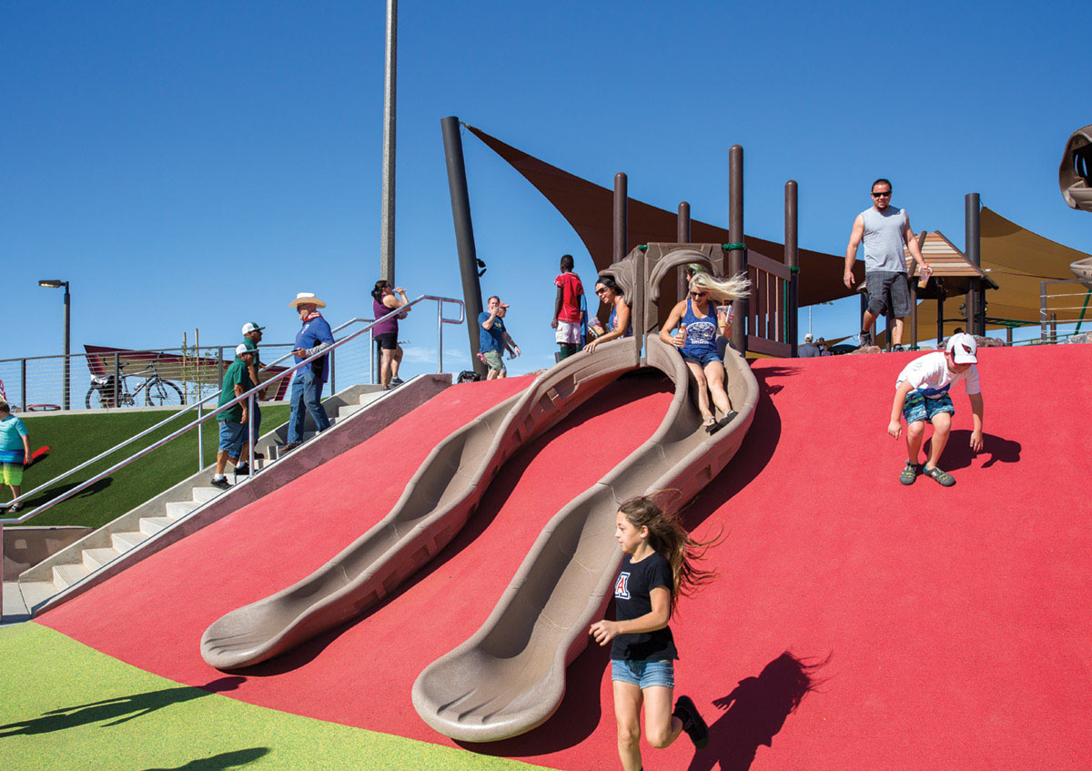One of the outstanding innovations that was included in the project was the fulfillment of the town's goal of achieving an inclusive playground - a space that would accommodate the play needs of children of all abilities and ages. Often times, designers only focus on ADA as a means to achieve inclusivity. At MCOP, the town staff, design team, and contracting team all worked together to develop inclusivity as a major detail. Features and play equipment were intentionally selected for the playground zone to provide for the various needs of children of all abilities. The team worked with a stakeholder group of local parent advocates who helped develop the park's playground area into a truly amazing amenity. To take the inclusive innovation a step further, the town and team developed a working partnership with Banner Health, Inc. The Banner Ironwood Medical Center team donated a $150,000 Grant to fund the rubberized safety surfacing throughout the play areas and splash pad to help the town achieve universal access and inclusivity. This public-private partnership provided innovation and a contribution that set a fantastic example for the industry and community.