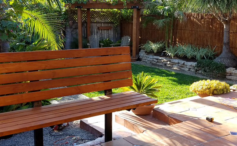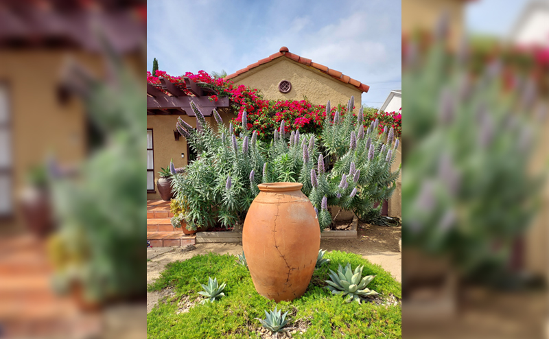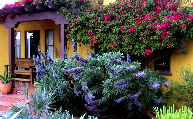 The design task was to reconcile an outdated landscape with existing Spanish Architecture. Visitors are first greeted by a sun drenched Bougainvillea (San Diego Red) draped over an entry pergola. The drought tolerant Mediterranean plants (Olea europaea, Agave, Thymus, Echium, and assorted grasses) were an obvious choice.
